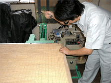 - 持ち帰った畳の大きさと厚みを計り、畳表の裁断をします。切った後はほつれないように、かっちりと止め作業をします。